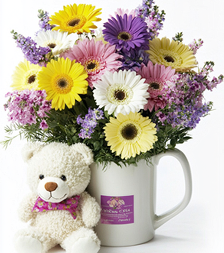 Send your loved one a beautiful bouquet of flowers to show them that you care. This heart-felt and heartwarming arrangement of yellow, pink, purple, and blue gerber daisies, an adorable teddy bear, and a darling mug is the perfect gift for someone you care about as they journey down the road to recovery. -